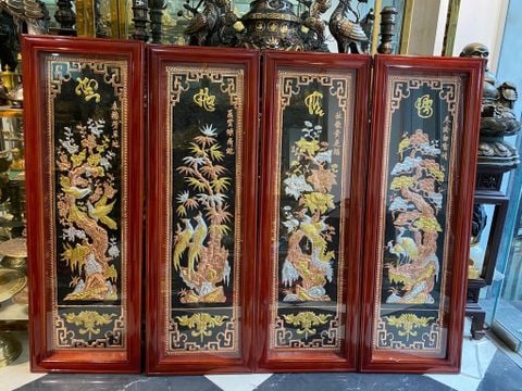 Tranh tứ quý bằng đồng cao 1m2 ngang 1m6 dát vàng bạc bọc kính